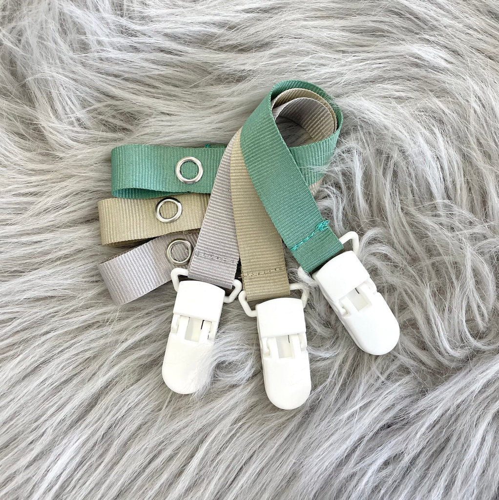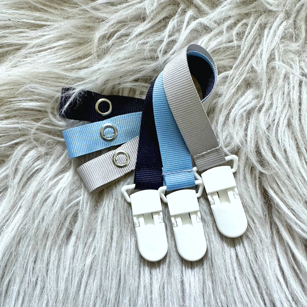 The Tiger Lily Dummy Clip is perfect for keeping dummies (and teethers/toys!) from falling to the ground. The actual clip is plastic and machine washable. In addition, these quick release clips are operational with one hand (no need to wake the sleeping baby!). The press stud makes it easy to remove the clip from the dummy if your little one falls asleep.