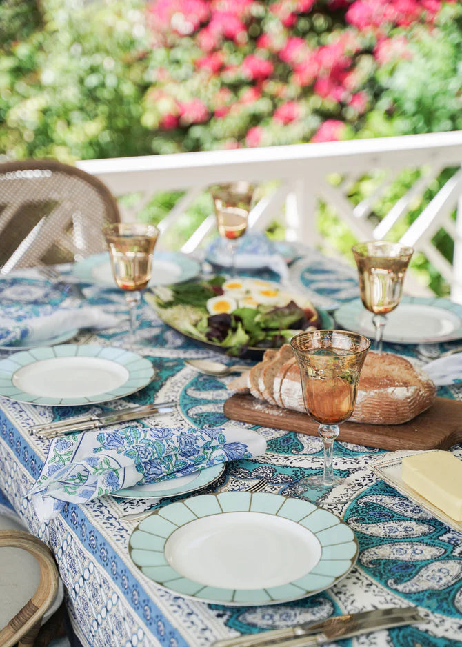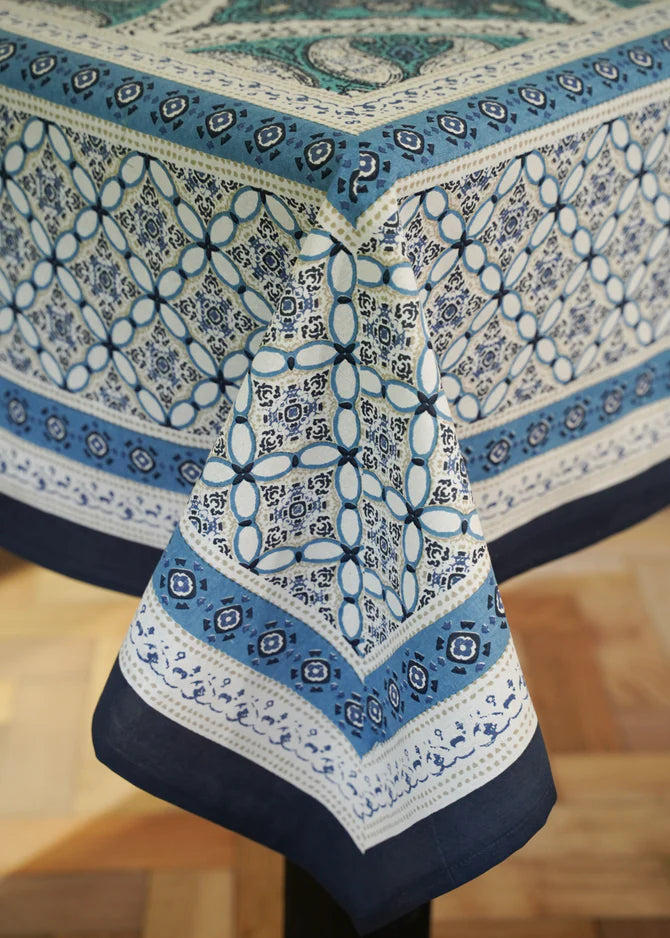 Dress your table with timeless charm. These classic 100% cotton hand block-printed tablecloths are individually crafted using traditional printing techniques, making each piece beautifully unique. This striking blue mandala design brings a calm, layered elegance to the table, perfect for relaxed outdoor lunches or beautifully styled indoor dining.