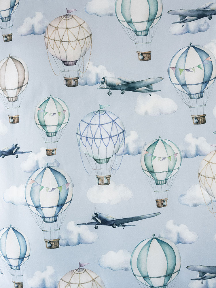 Your little one’s dreams will soar high above the clouds with Fly with Me! They’ll be taking flight through uncharted skies in magical floating hot air balloons and gliding airplanes, ready for an exhilarating adventure. Printed on cotton, the joyous palette of hues of greens, blues and earthy neutrals decorates the serene sky blue ground, with a matching blue reverse.