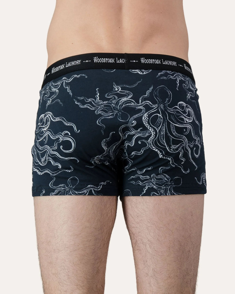 A wide elastic waistband with a brushed interior keeps them secure without digging in, and the contoured pouch ensures a supportive, streamlined shape. Finished in a striking white-on-black octopus print, this bold design brings a splash of personality to your basics drawer.