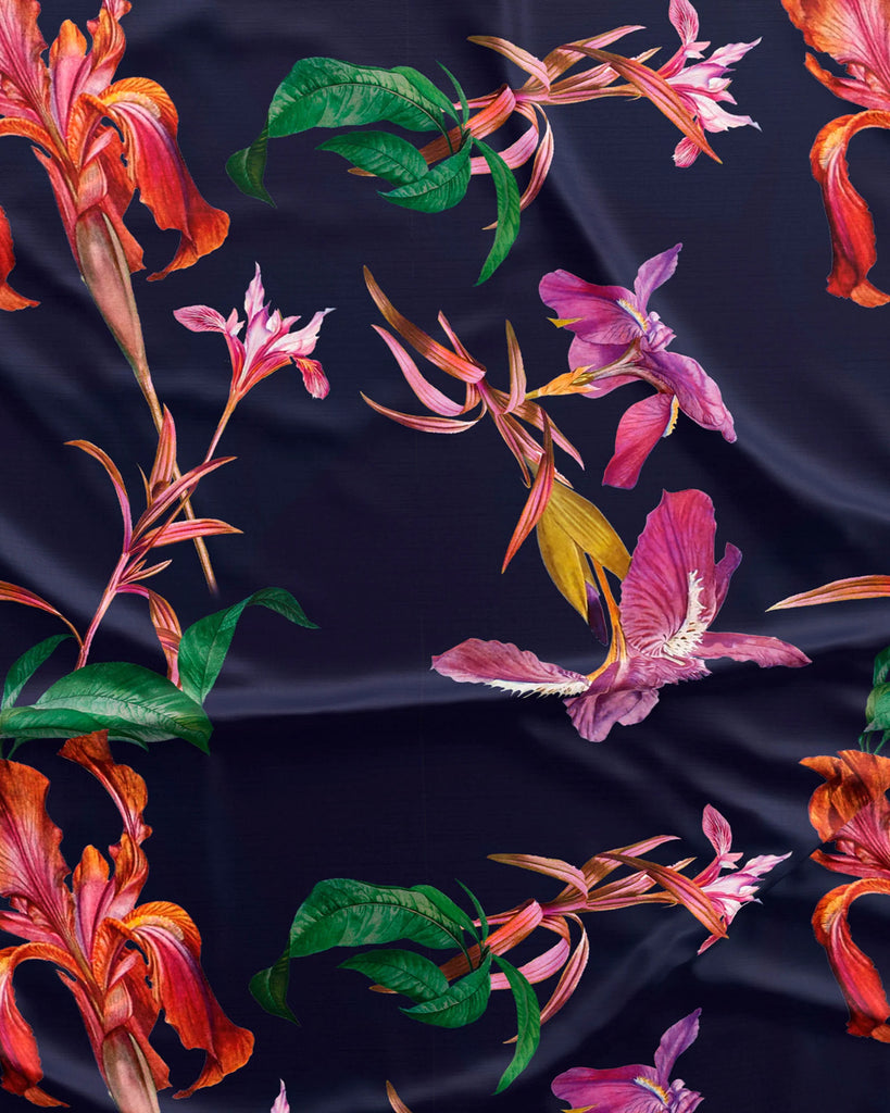 The vibrant floral design — featuring lush irises and tropical blooms against a deep navy base — captures the perfect balance between elegance and playfulness.