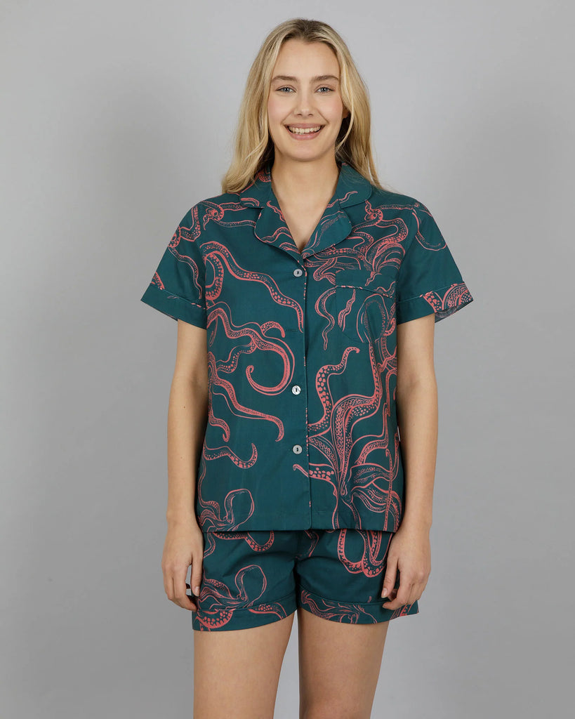 Featuring a lively pink octopus print on a deep green backdrop, this ocean-inspired design adds a splash of character and charm to your loungewear collection.