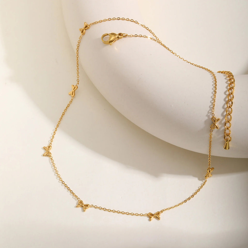 Delicate, playful, and effortlessly elegant — the Mini Bow Necklace is the perfect finishing touch to any outfit. Featuring tiny bow details spaced along a fine gold-plated chain, this necklace is designed for easy layering or subtle everyday wear.